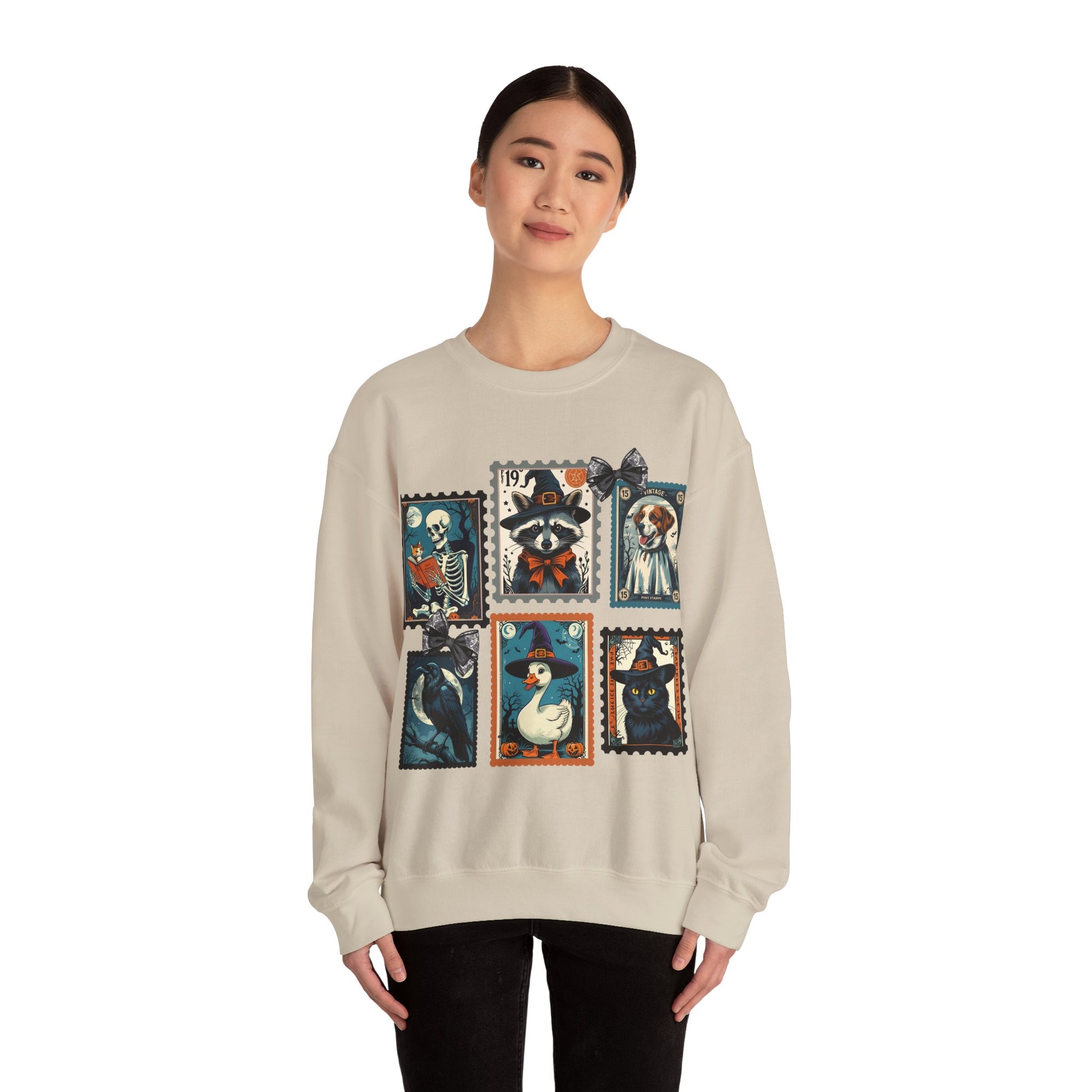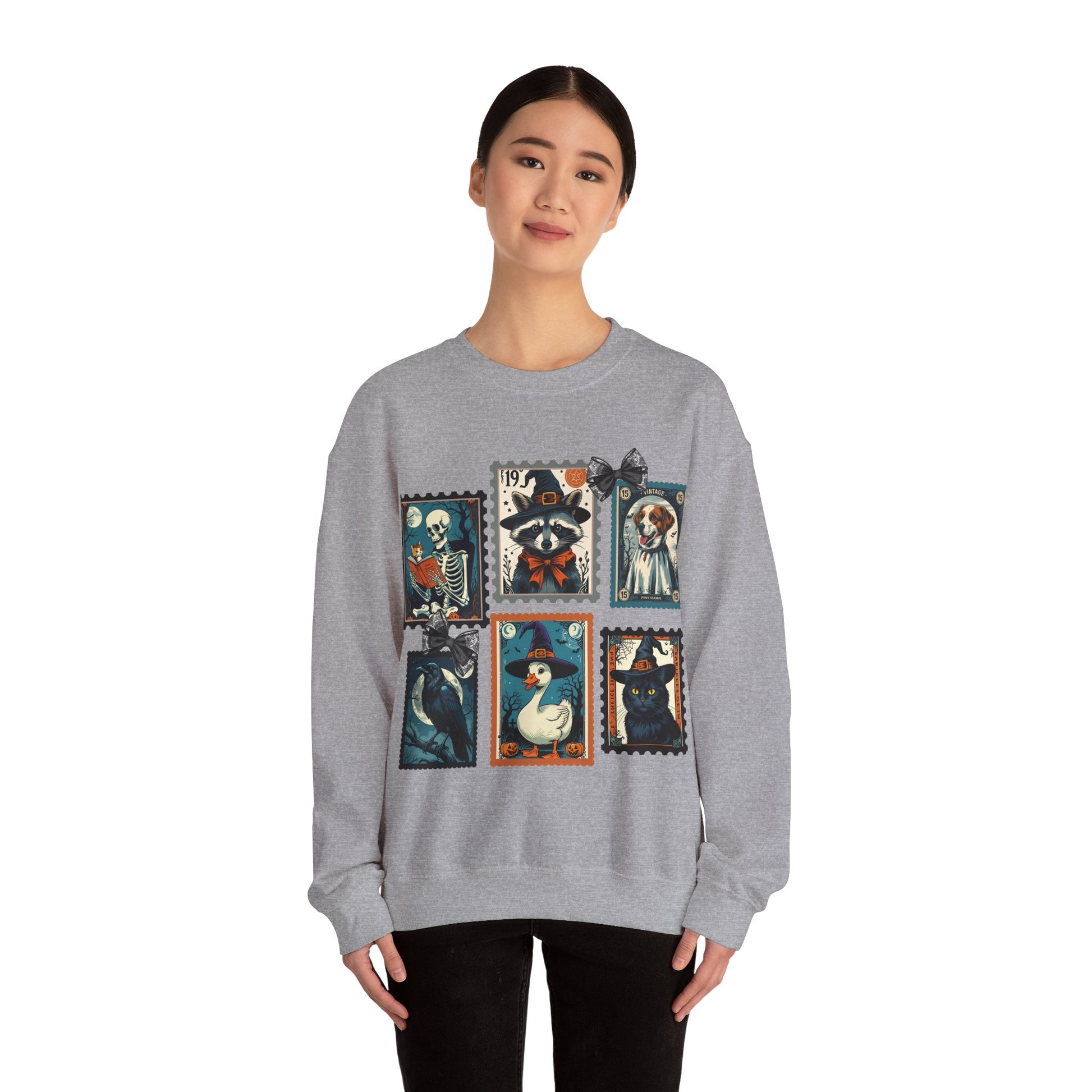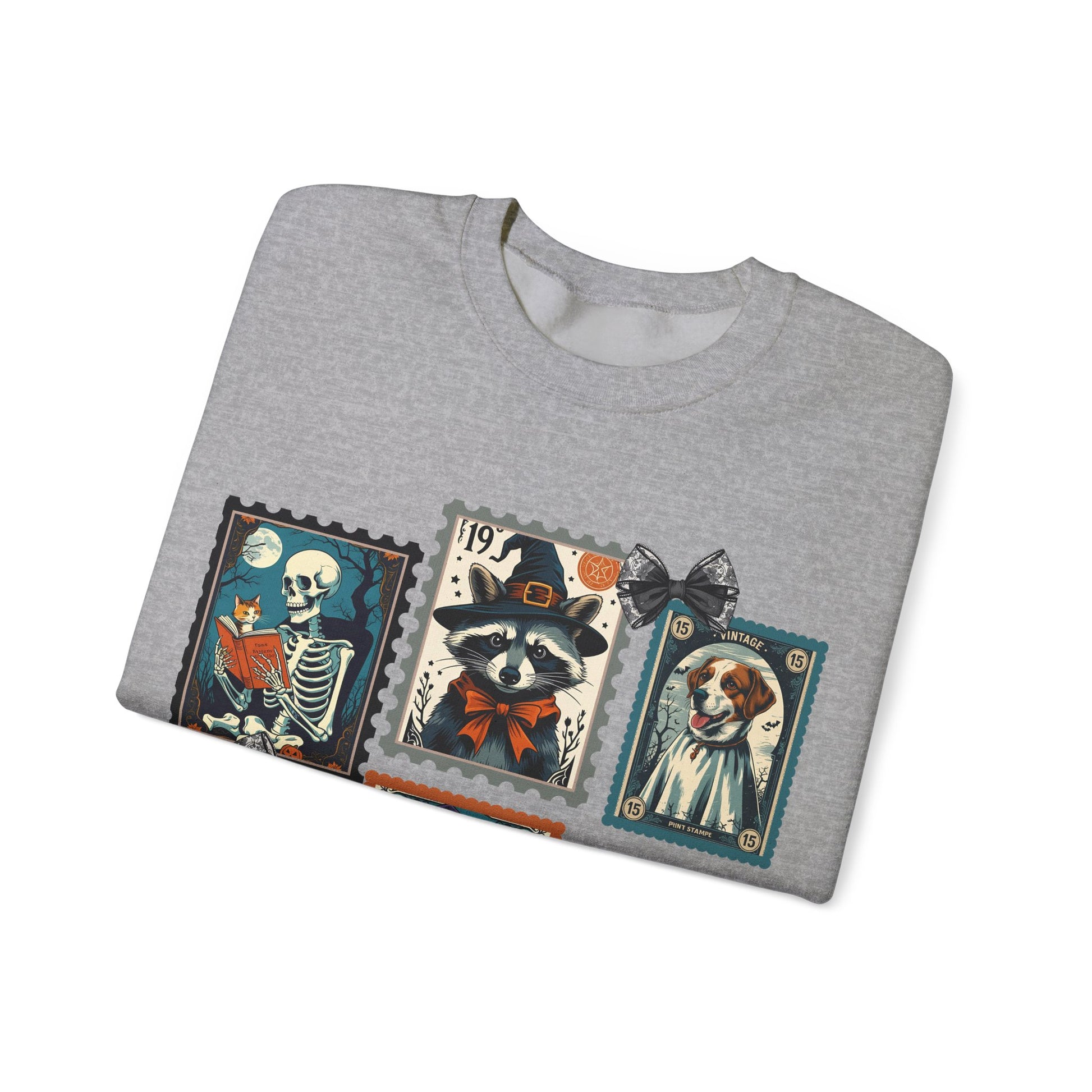 Vintage-Inspired Crewneck Sweatshirt with Spooky Stamp Design, Cozy Fall Apparel, Halloween Fashion, Unisex Sweatshirt, Quirky Gift Idea